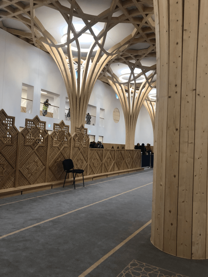 The project has been in development for years, and 23 million pounds spent. Ecoism and sustainability in Islam also involves spending money resourcefully. And in the awe felt at the aims of the project it would be dishonest if I didn’t consider expenditure. However, the materials used and bought, are investments. The usage of wood, as well as physically reminding us of nature and the reliance early Muslims had on wood to record ayahs of the Quran as they were revealed, uses significantly less energy when produced. And the golden dome is actually a durable copper alloy; ‘tecu gold’ from Germany. Beyond this, much of the money has been directly invested into the infrastructure– with only 0.09% of the funds used for the administration fees. Many Masjid’s in the UK cannot afford to pay employees of the mosque, and show the required appreciation, here, the Imam and Director are full time employees and part of the building is two houses for them, alongside the mosque building. The raising of the money has come from the local community as well as the global Muslim community, and as these funds are raised from dispersed individuals and communities – there is nothing attached other than Allah’s promised reward for charity. And the raising and usage of this money continues to emphasise community efforts as does the physical building. Just as the wooden pillars inside, holding up the mosque roof most accentuate the idea of unity, the project too is centred on creating a sustainable community and fostering unity. There is a sense as you walk around the masjid that the wooden, tree like branches hold up the roof of the Masjid, and their roots grounded in key beliefs accepted by all. These roots are faith and belief in Allah and tawhid – the oneness of Allah, the existence of Allah.